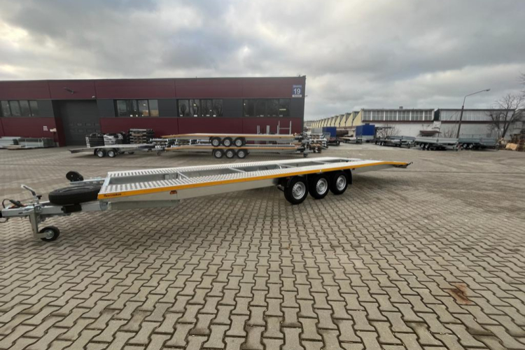 Anhänger für den Transport von zwei Fahrzeugen mit schrägem Heckbereich. Zulässiges Gesamtgewicht 3500 kg. Die Möglichkeit der Einstellung der Breite der Ladeflächen ermöglicht ein bequemes Beladen.