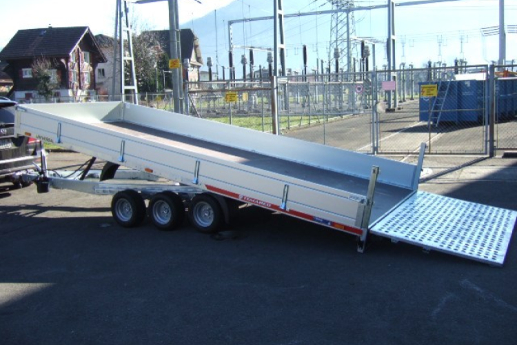 Die Serie universeller Autotransporter mit kippbarer Konstruktion, niedrigem Anfahrwinkel und einer großen Auswahl an zusätzlichem Zubehör. Kippen der Ladefläche erfolgt über ein komfortables Hydrauliksystem. Beladung über geteilte Auffahrrampen (die unter der Ladefläche versteckt werden können) oder Aufklappen der hinteren Rampe in Stahlausführung.. Je nach gewählter Version hat der Anhänger R10C oder R13C Räder. Geschweißter, feuerverzinkter Rahmen, optional ausgestattet mit einem Satz Querstreben zur zusätzlichen Verstärkung des Rahmens. Die Transportfläche besteht aus rutschfestem wasserfestem Sperrholz. Das maximale mögliche zulässige Gesamtgewicht beträgt 3500 kg.